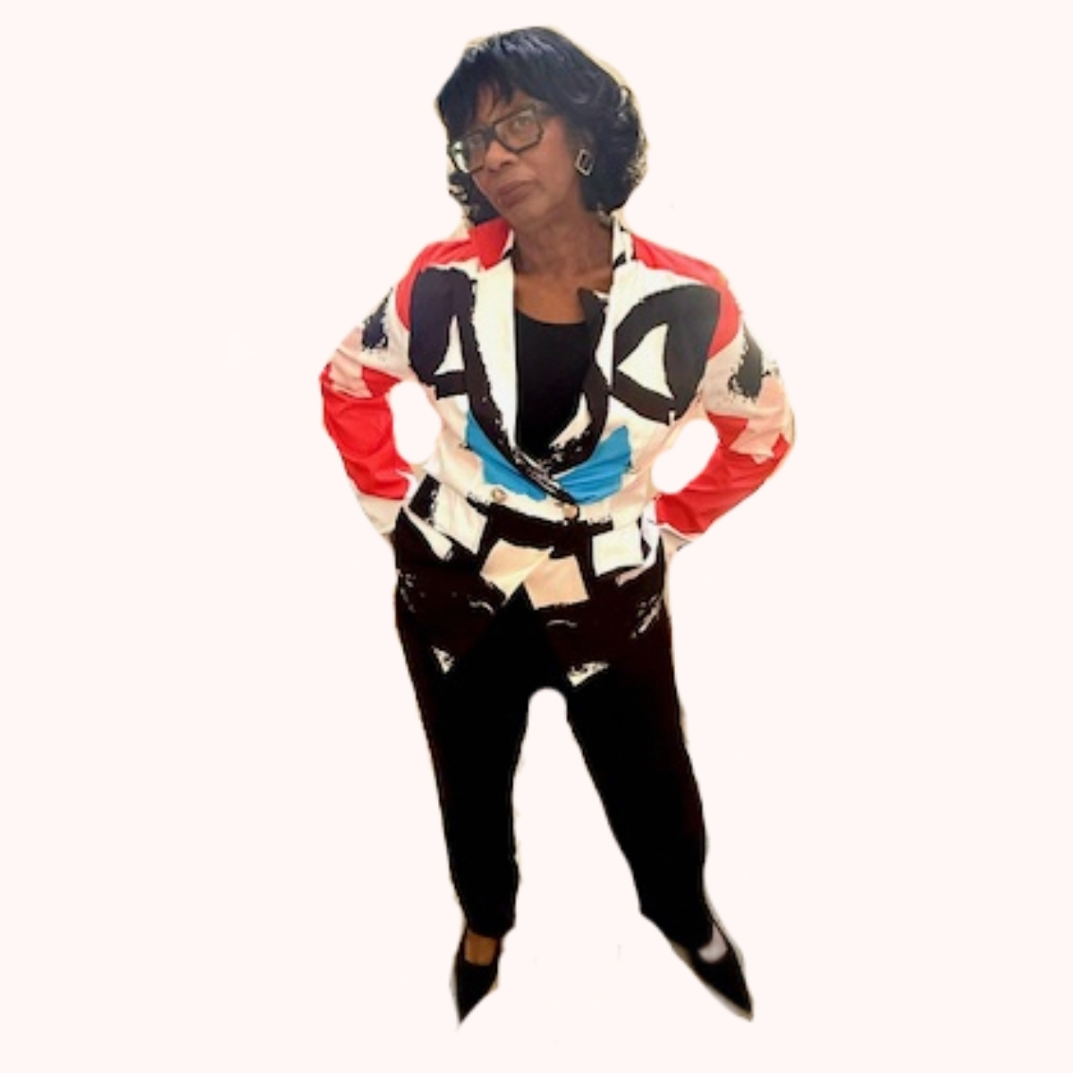 Soft cotton double breasted blazer with accent buttons and abstract print
